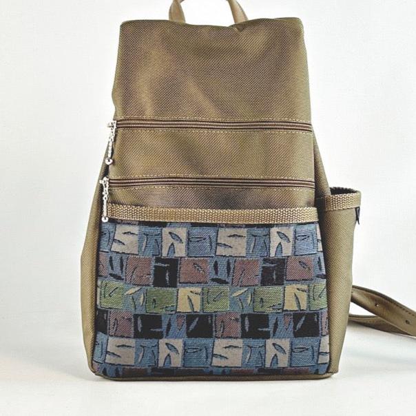 Two zippered security pockets next to back, Two exterior zip pockets on opposite side, Open side pocket for water bottle or phone, interior key fob. Two adjustable 32” leather straps and top carry loop handle. Choose your decorative open fabric accent pocket below or call for newest fabrics.