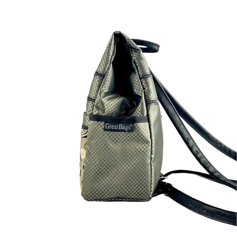 Super Light Side-Entry Backpack Purses in Gray Ripstop Nylon. This small purse-size is our most popular size backpack for daily use. The larger sizes will hold more for commuting or travel. This Gray diamond ripstop fabric is a nice change from black, call us to order a larger size if desired.